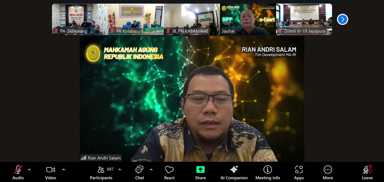 Zoom meeting tersebut merupakan sosialisasi kepada seluruh wilayah pengadilan tentang pembaruan aplikasi SIPP, Pembaruan aplikasi Sistem Informasi Penelusuran Perkara (SIPP) kembali diluncurkan di lingkungan peradilan sebagai upaya meningkatkan kualitas pelayanan dan transparansi informasi perkara. Selain itu, pembaruan ini juga memperkuat integrasi dengan aplikasi internal lainnya sehingga proses administrasi perkara menjadi lebih efisien dan minim kendala teknis. Dengan adanya peningkatan ini, diharapkan setiap satuan kerja pengadilan dapat memberikan layanan yang lebih responsif sekaligus memperkuat akuntabilitas publik di era digital.(TH)