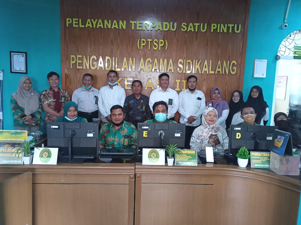 Berdasar pada Surat Keputusan Ketua Pengadilan Agama Sidikalang Nomor: W2-A13/531/PP.01.3/VII/2021 tanggal 8 Juli 2021 tentang Tim Pelaksana Diklat Di Tempat Kerja (DDTK) Pengadilan Agama Sidikalang kelas II tahun 2021 dan sesuai jadwal, pagi ini Jumat tanggal 9 Juli 2021 petugas Pelayanan Terpadu Satu Pintu (PTSP) Pengadilan Agama Sidikalang. Acara dimulai dengan pembacaan 8 nilai utama Mahkamah Agung RI yang dipandu oleh Roihan As’Adi Hasibuan AMA yang diikuti oleh seluruh pegawai Pengadilan Agama Sidikalang.