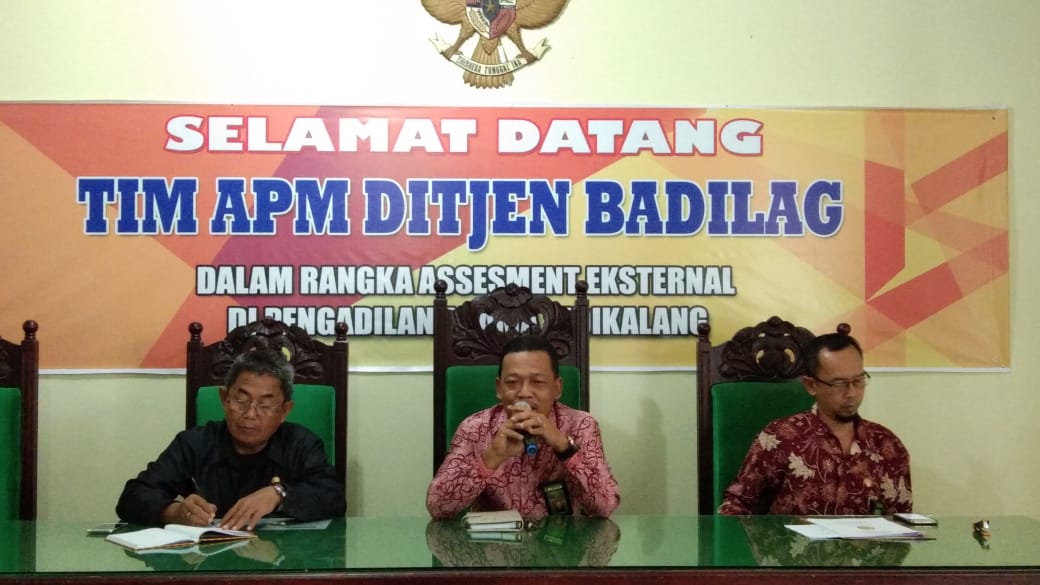 Sidikalang - 26 November 2018. Berdasarkan surat Direktur Jenderal Badan Peradilan Agama Nomor: 3177/DJA/OT.01.3/XI/2018, Pengadilan Agama Sidikalang melaksanakan assessment eksternal APM Badilag Gelombang III Tahun 2018. Bertempat di ruang sidang, telah dilaksanakan opening meeting assessment eksternal yang dihadiri seluruh pegawai Pengadilan Agama Sidikalang. Adapun Asesor APM Ditjen Badilag yang melaksanakan assessment eksternal di Pengadilan Agama Sidikalang yaitu Bapak Drs. Khurtubi, M.H. dan didampingi oleh Bapak Amrani, S.H., M.H.